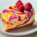 A delightful lemon cheesecake with vibrant raspberry swirls, capturing the essence of summer in every slice.