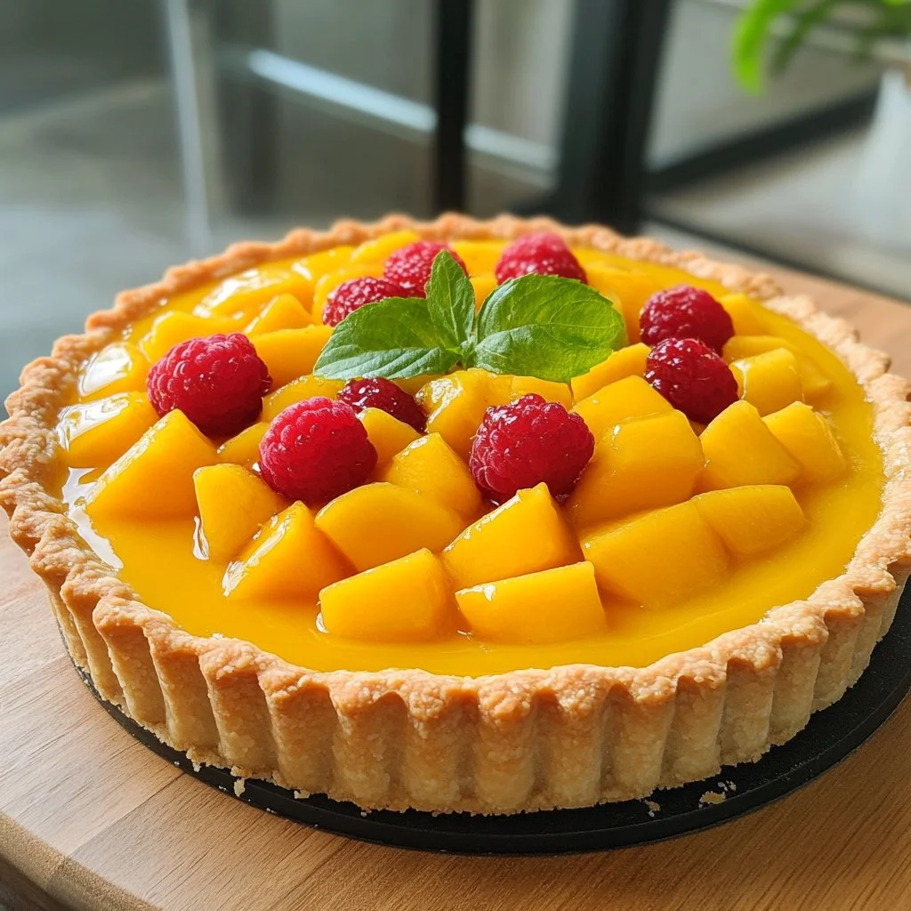 A delightful mango curd tart featuring sweet mango pulp and zesty lime, combining tropical flavors and a buttery crust.