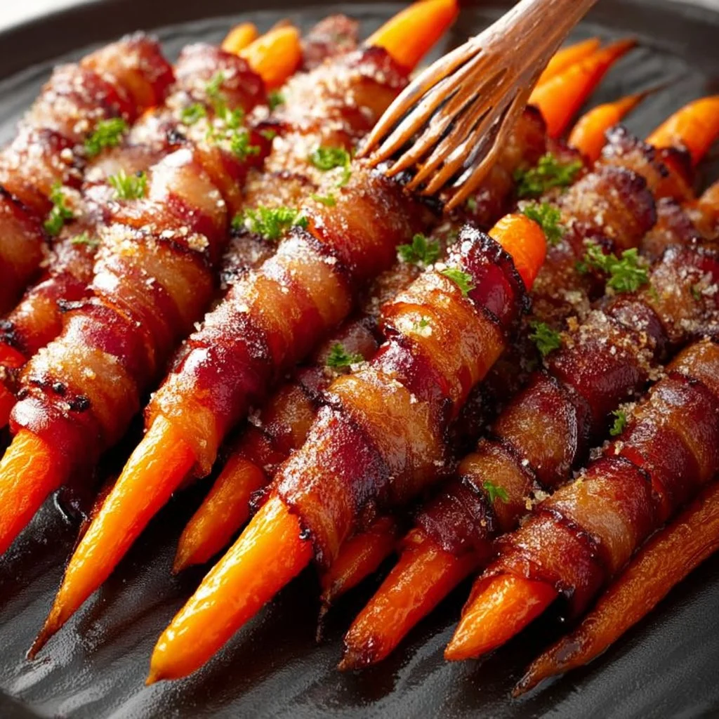 A delightful combination of maple syrup and crispy bacon wrapped around tender carrots, creating a mouthwatering side dish.