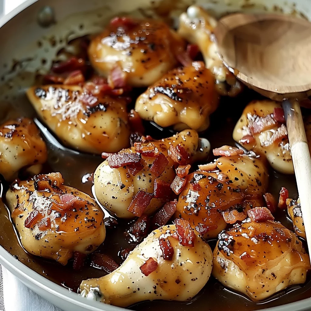- Season chicken with salt and pepper for 10 minutes for enhanced flavornAdd bacon to chicken just before serving to maintain crispinessnStir glaze continuously to prevent sticking and maintain smoothness