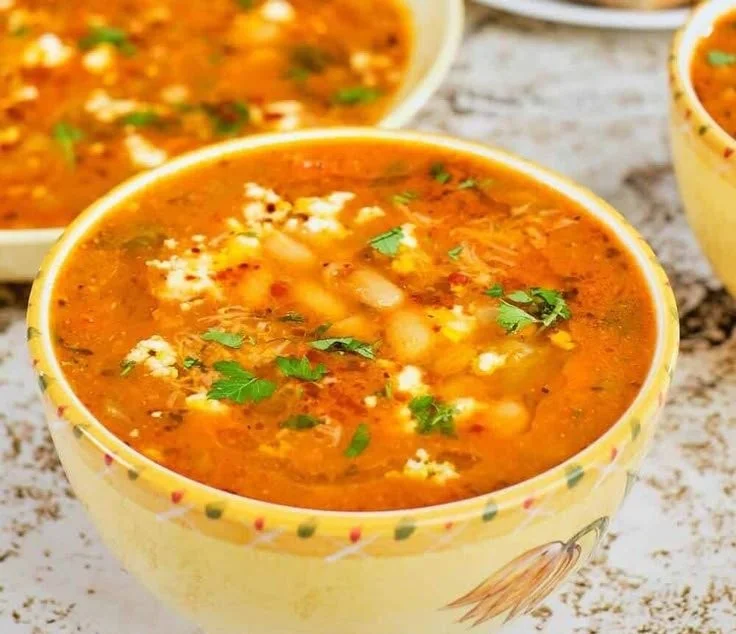 A warm, hearty Mediterranean white bean soup featuring a blend of white beans, fresh vegetables, and aromatic herbs.