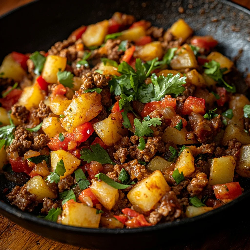 A comforting Mexican ground beef stir-fry with tender potatoes and fresh bell peppers, perfect for busy weeknights.