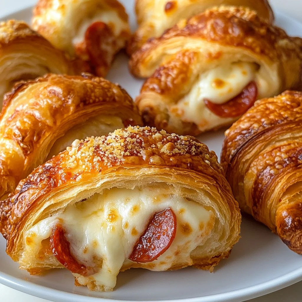 Delicious and flaky croissant rolls stuffed with gooey mozzarella and savory pepperoni, perfect for snacks or gatherings.