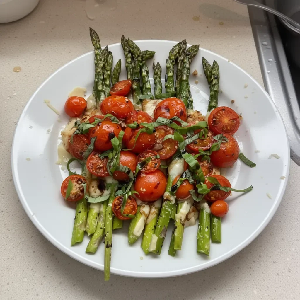 A simple yet flavorful side dish featuring roasted asparagus topped with Parmesan cheese, garlic, and tomatoes, drizzled with balsamic glaze.