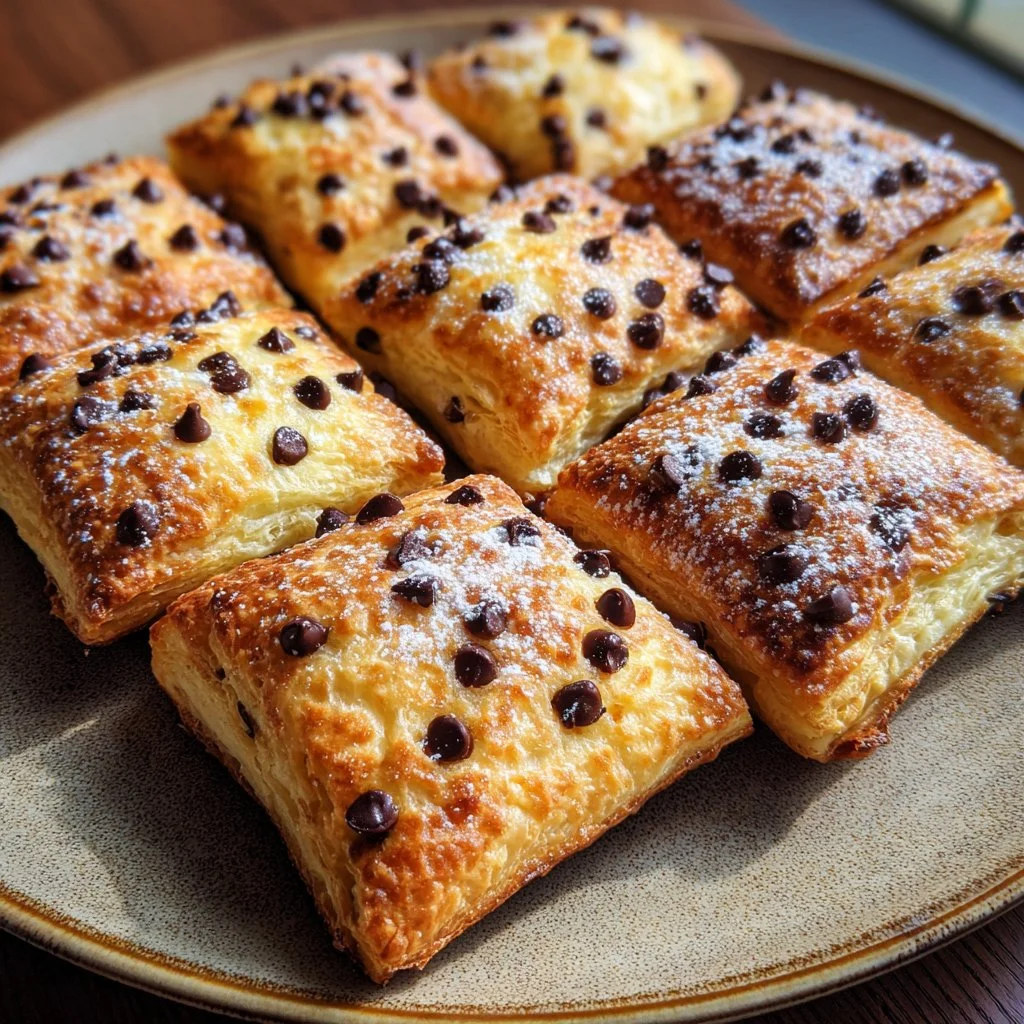 Delightful ricotta chocolate chip pastry squares, combining creamy ricotta and rich chocolate chips wrapped in flaky puff pastry.