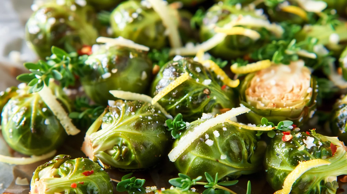 - Optionally, mix the roasted Brussels sprouts with fresh lemon juice, zest, grated Parmesan cheese, and thyme leaves.