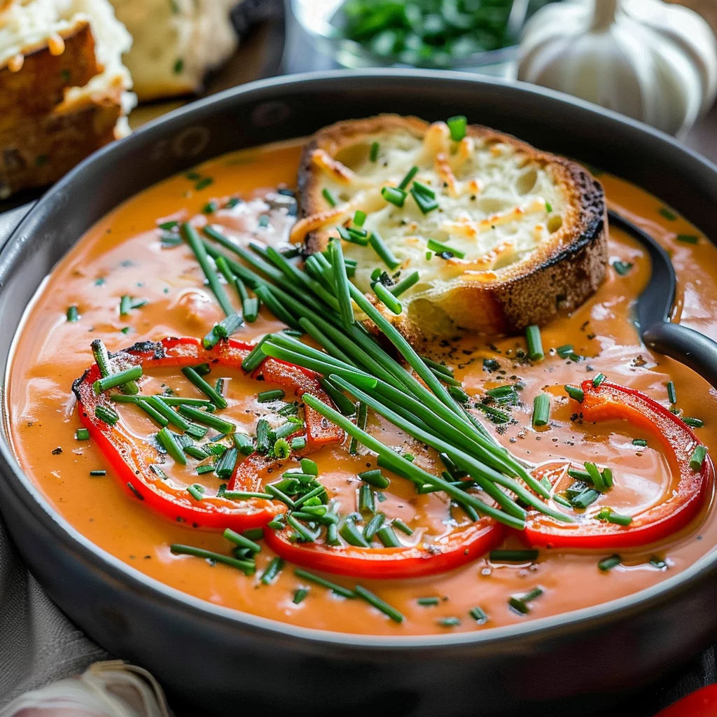 Presentation plays a vital role in the enjoyment of any dish. Ladle the Roasted Red Pepper Gouda Soup into bowls, garnishing with a sprinkle of chopped chives for a pop of color and a fresh, herbaceous note. This simple touch elevates the presentation, adding a hint of elegance to your table.