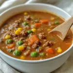 Once the onions and garlic soften, add in the ground beef. Cooking until it browns ensures that the beef releases its flavors into the aromatic base. Drain any excess fat to keep the soup light and enjoyable. The preparation becomes effortless as you incorporate the diced potatoes and mixed vegetables, creating a vibrant and inviting mixture.