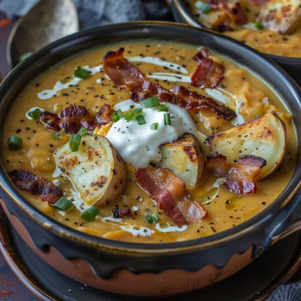 This simple loaded baked potato soup recipe offers a delightful blend of creamy, savory, and smoky flavors that satisfy the soul. The combination of potatoes, bacon, and cheese creates a comforting dish that’s both hearty and indulgent.