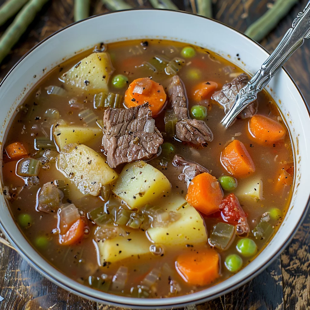 Don’t overlook the canned diced tomatoes. They infuse the soup with a tangy depth, complementing the beef’s robust flavor. For added texture, incorporate green beans. Whether fresh or frozen, they provide a pop of color and a slight crunch, rounding out the soup’s ensemble of ingredients.
