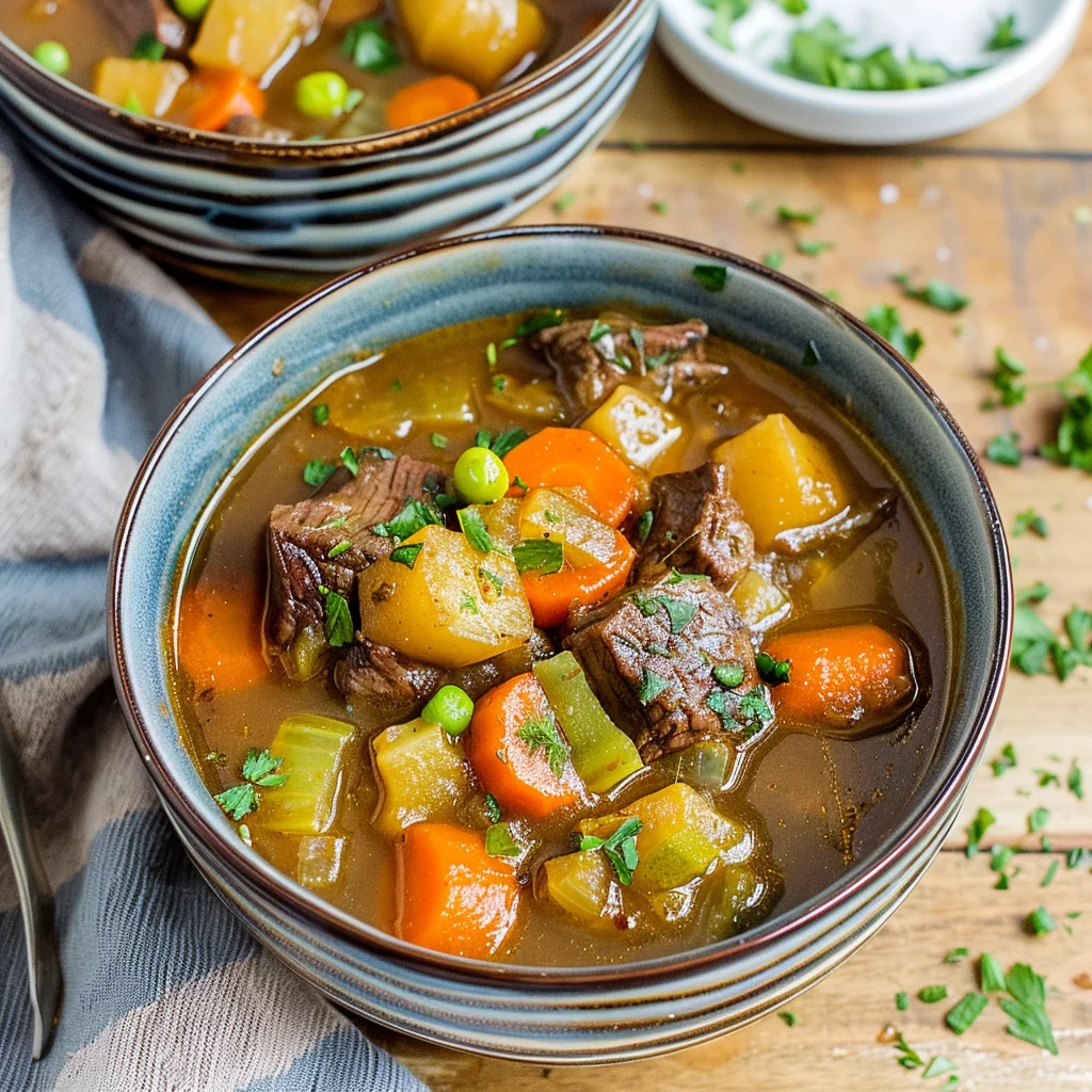 Set the slow cooker to low for 7½ to 8 hours, or high for 3½ to 4 hours. The slow cooking process allows the beef to become incredibly tender, while the vegetables absorb the rich flavors of the broth. In the last 15 minutes, stir in frozen peas for a pop of color and sweetness.