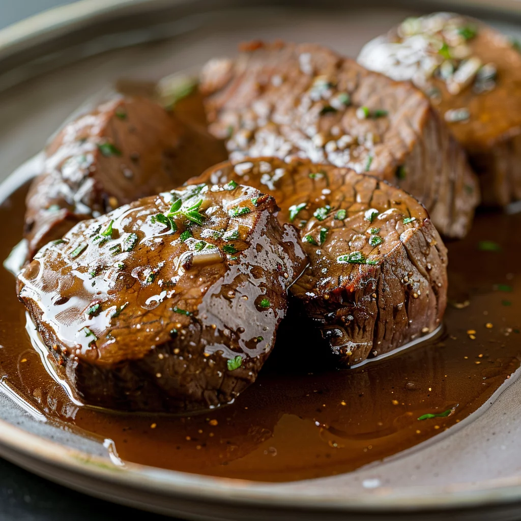 - Slice the beef tenderloin and serve with the thickened sauce.