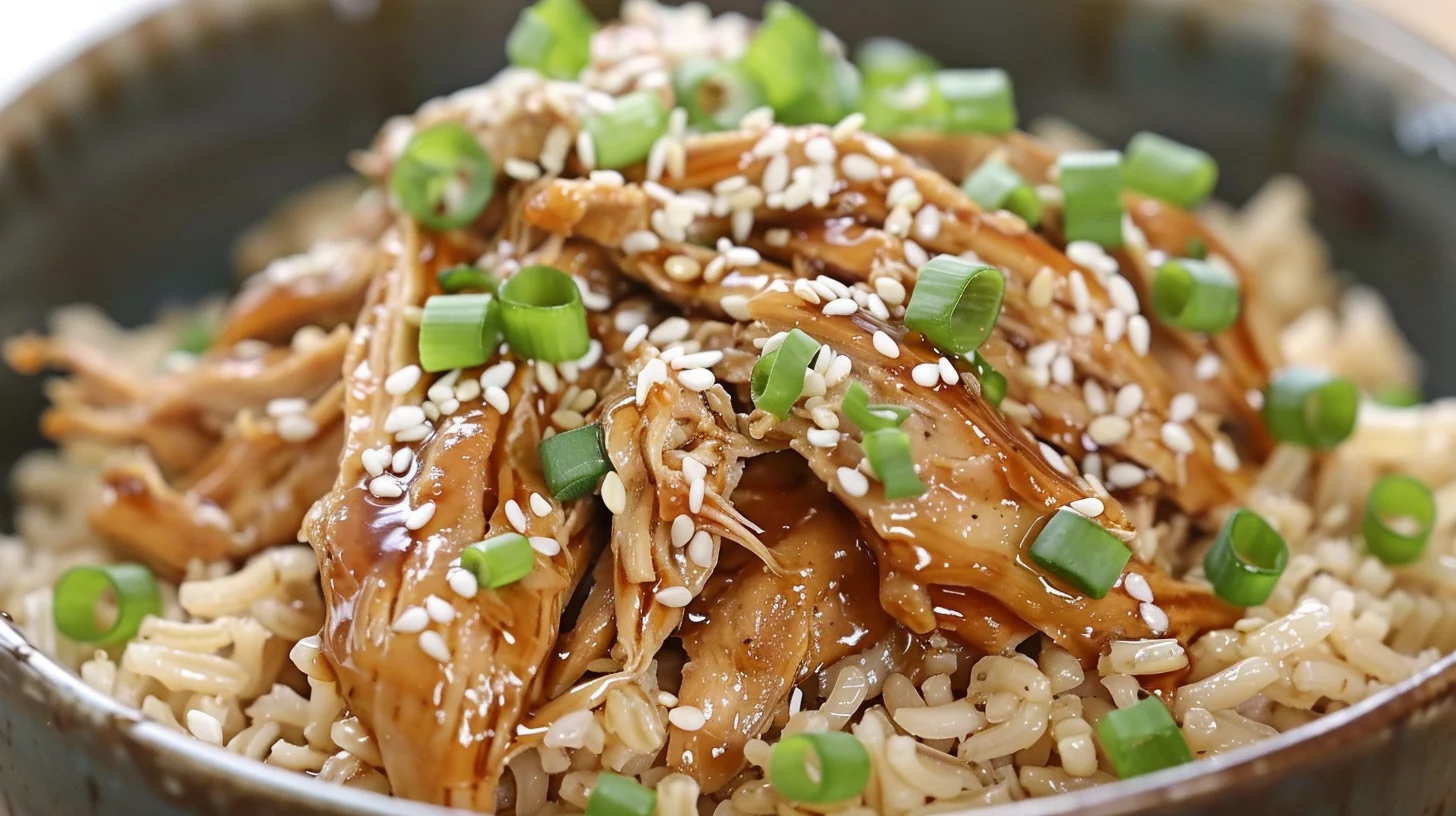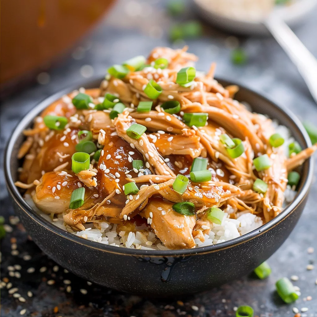 - Once the chicken is cool enough, shred it using two forks or your hands, and return it to the slow cooker. If you thickened the sauce on the stove, pour it back into the slow cooker now. Mix the chicken well with the sauce. Serve it over rice, garnished with chopped green onions and sesame seeds.
