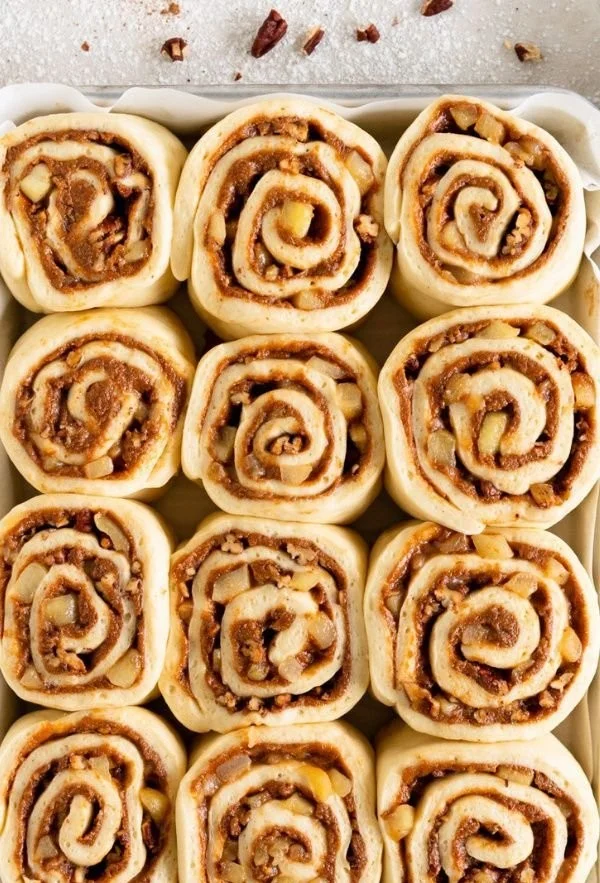 - Assemble the rolls: Roll out the brioche dough on a floured surface into a large rectangle. Spread the brown sugar filling evenly across the dough. Evenly distribute the apple filling, then sprinkle toasted pecan halves on top. Roll the dough tightly from the long side into a log. Slice the log into equal pieces and place them in a greased baking dish. Cover and let rise for about 30-40 minutes.