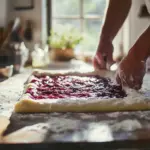 - Sprinkle the blueberries evenly over the dough, then roll it up tightly to form a log.