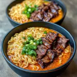 A vibrant and comforting spicy Korean ramen featuring tender grilled beef in a creamy broth.