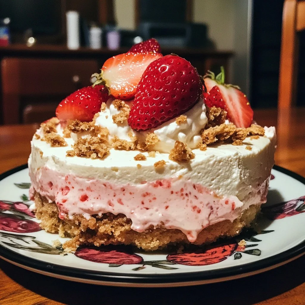 A no-bake Strawberry Crunch Cheese Cake that combines a buttery graham cracker crust with rich cream cheese filling, topped with fresh strawberries and a strawberry jam glaze.