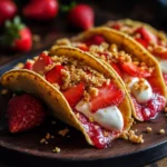 A delightful twist on traditional desserts, these tacos combine creamy cheesecake filling, fresh strawberries, and crunchy cereal in a fun taco-shaped cookie shell.