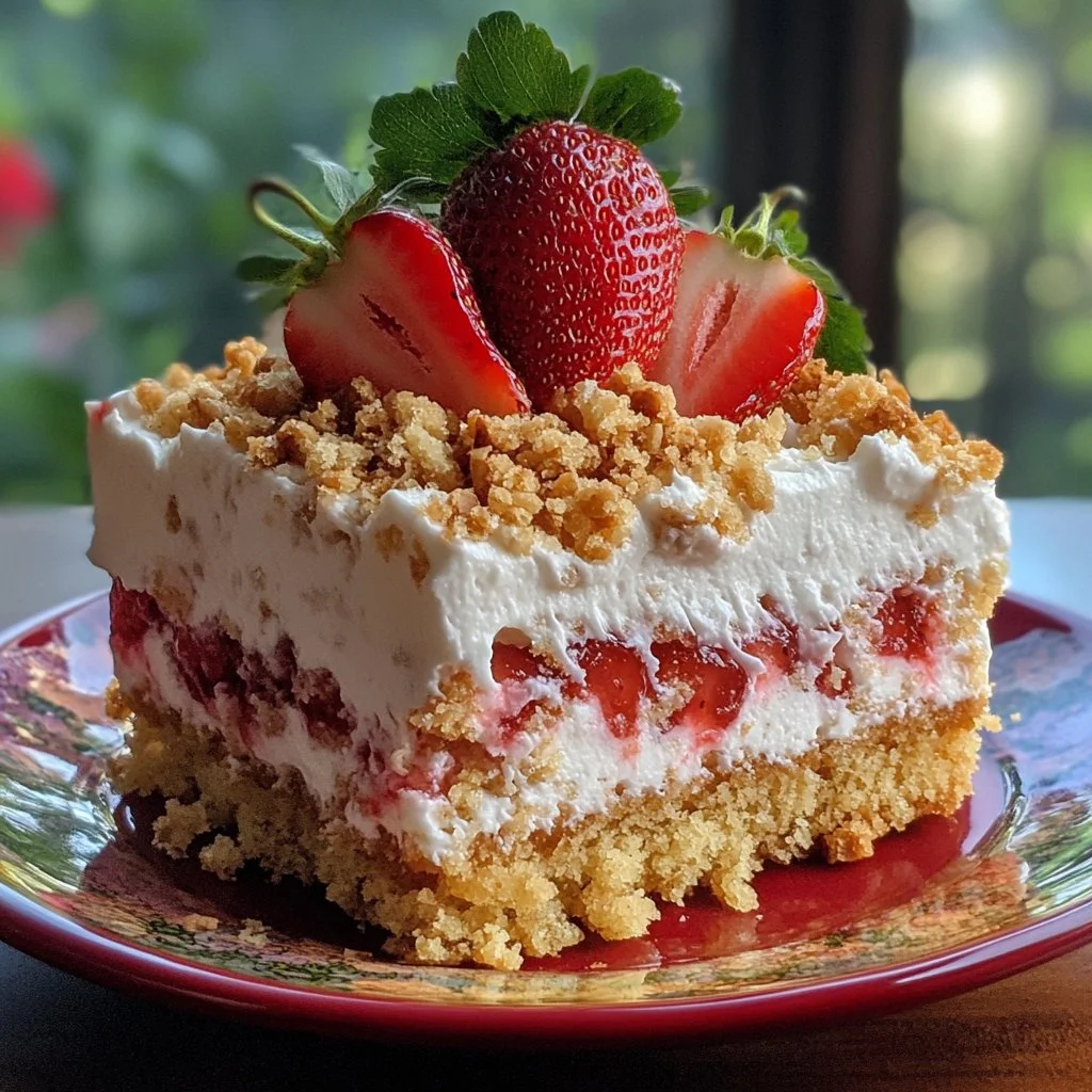 A nostalgic dessert made with a moist vanilla cake soaked in strawberry Jell-O, topped with whipped cream, fresh strawberries, and a crunchy graham cracker topping.