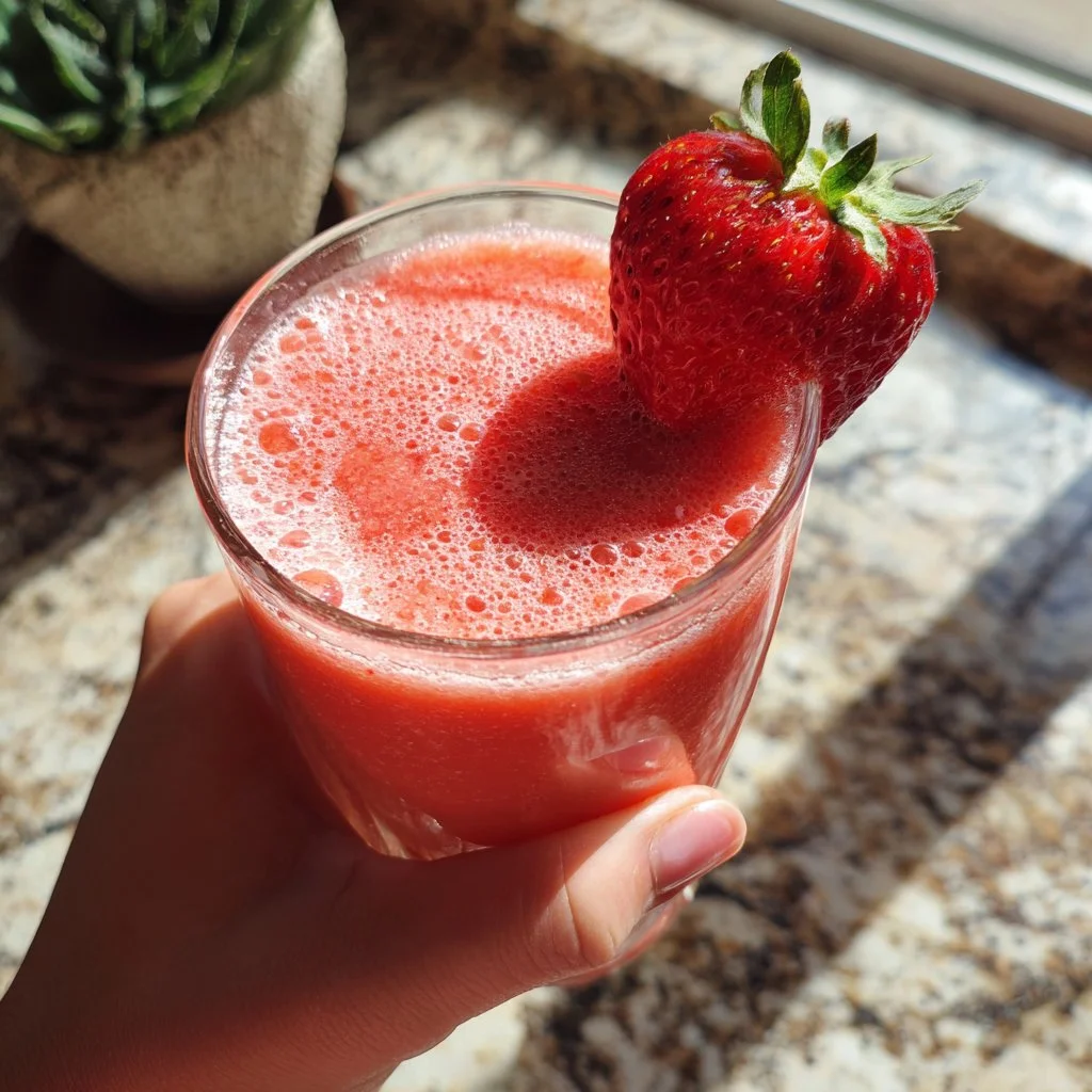 A refreshing smoothie blending frozen strawberries and fresh lemon juice, perfect for a cooling summer drink.