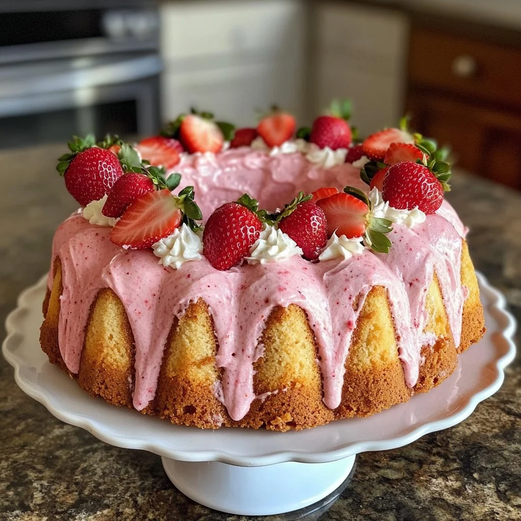 A delightful cake that combines the rich, buttery texture of pound cake with the sweetness of fresh strawberries, embodying the essence of a summer strawberry milkshake.