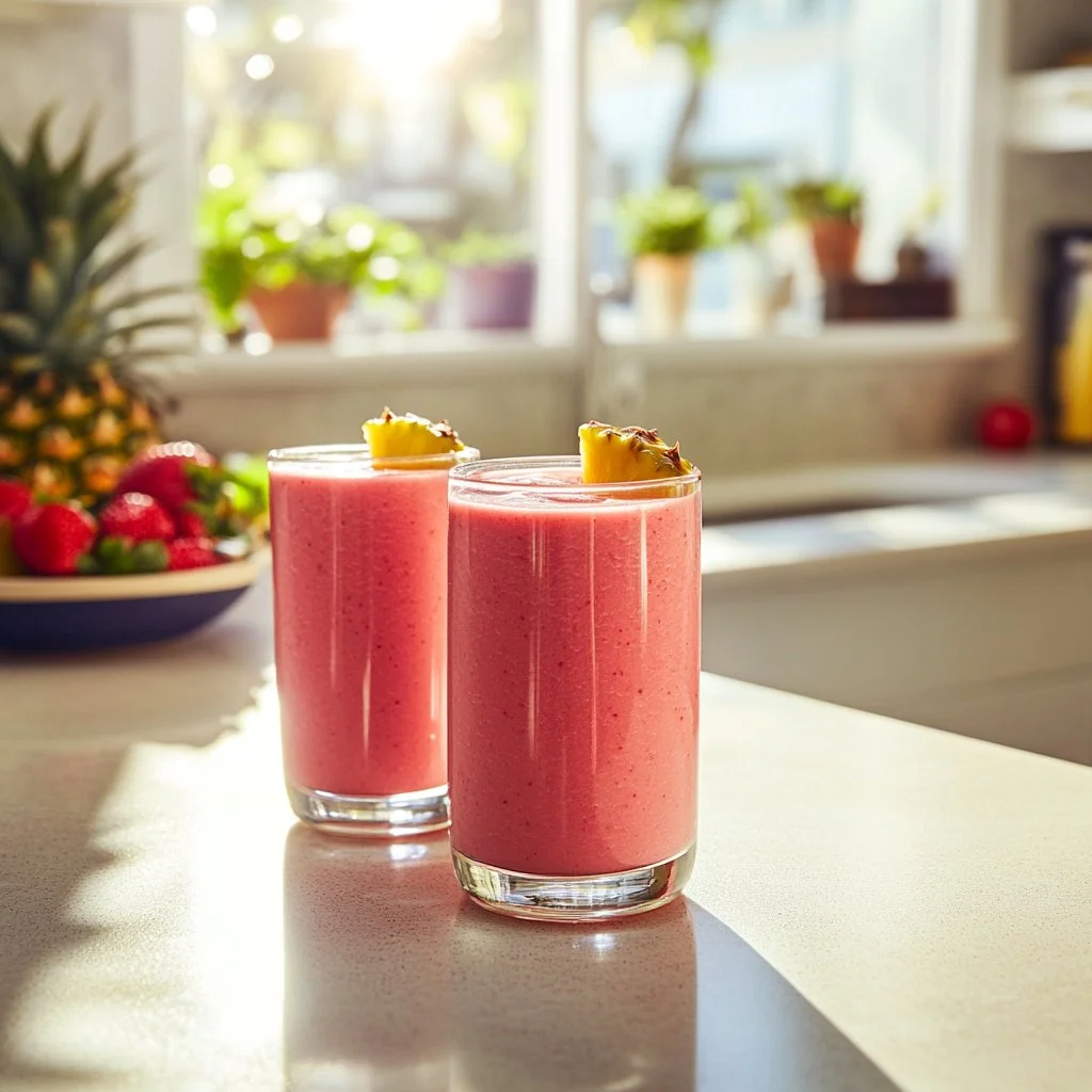 A refreshing strawberry pineapple smoothie that transports you to summer afternoons with its sweet and tangy flavors.
