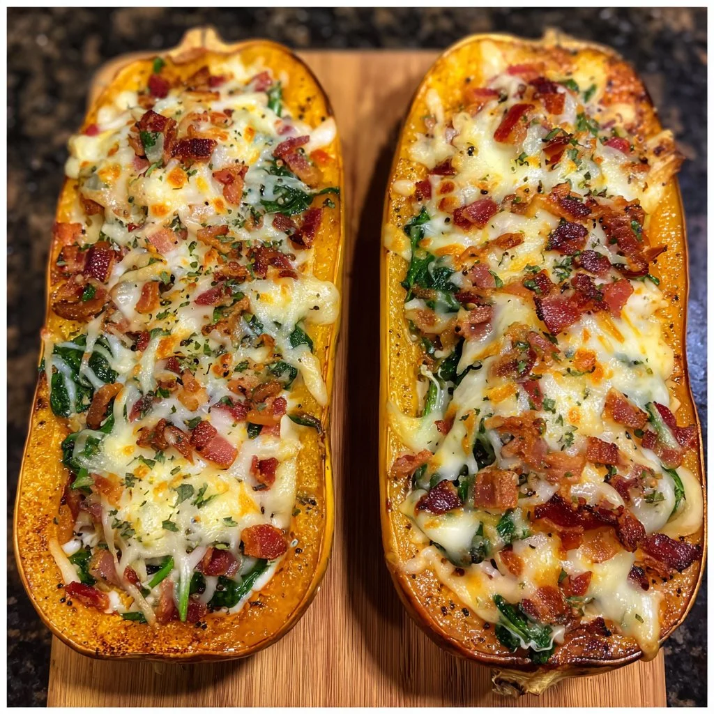 A comforting dish featuring roasted butternut squash filled with spinach, crispy bacon, and gooey cheese, perfect for autumn evenings.