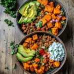 A vibrant and delicious Sweet Potato Taco Bowl featuring roasted sweet potatoes, seasoned beef, and fresh toppings, perfect for busy weeknight dinners.