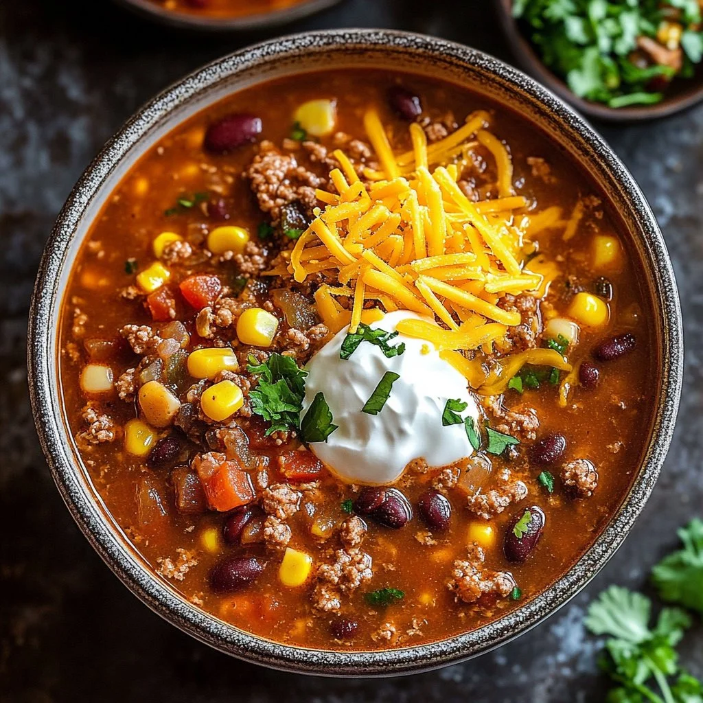 A comforting and hearty taco soup that combines ground beef or turkey with beans, corn, and spices, perfect for busy weeknights.