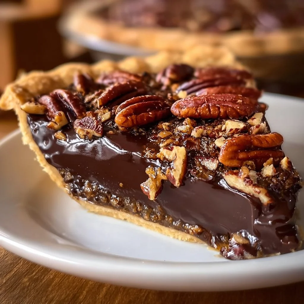 A rich and indulgent pie combining chocolate and toasted pecans in a buttery crust, perfect for holiday gatherings.