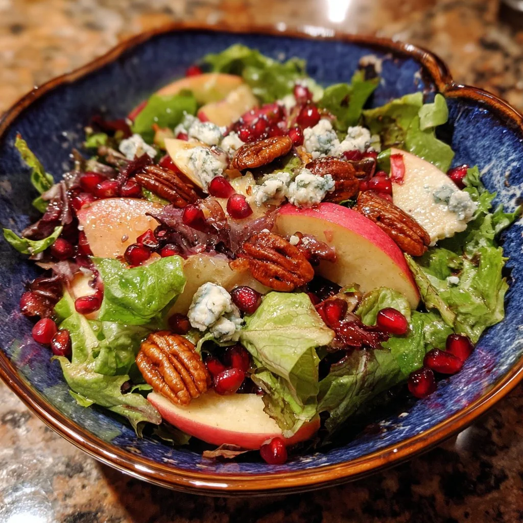 Consider arranging the components in sections for a beautiful presentation. Place the vibrant mixed greens at the base, followed by arranged apple slices, then sprinkle the pomegranate seeds, crumbled blue cheese, and candied pecans artistically on top.
