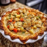 A comforting Vegan Thanksgiving Pot Pie with chick’n, vegetables, and herbs wrapped in a flaky crust, perfect for your holiday gathering.