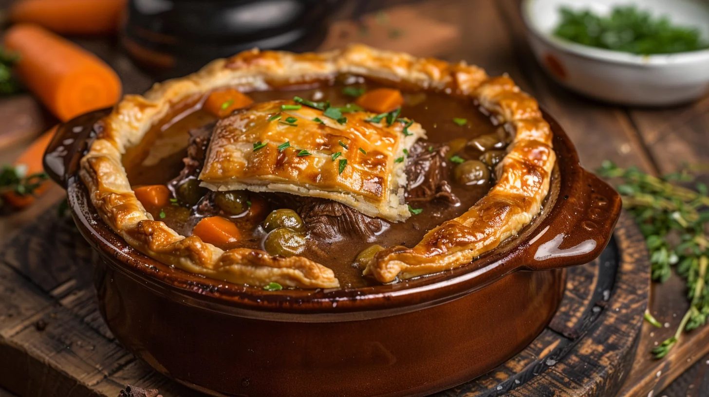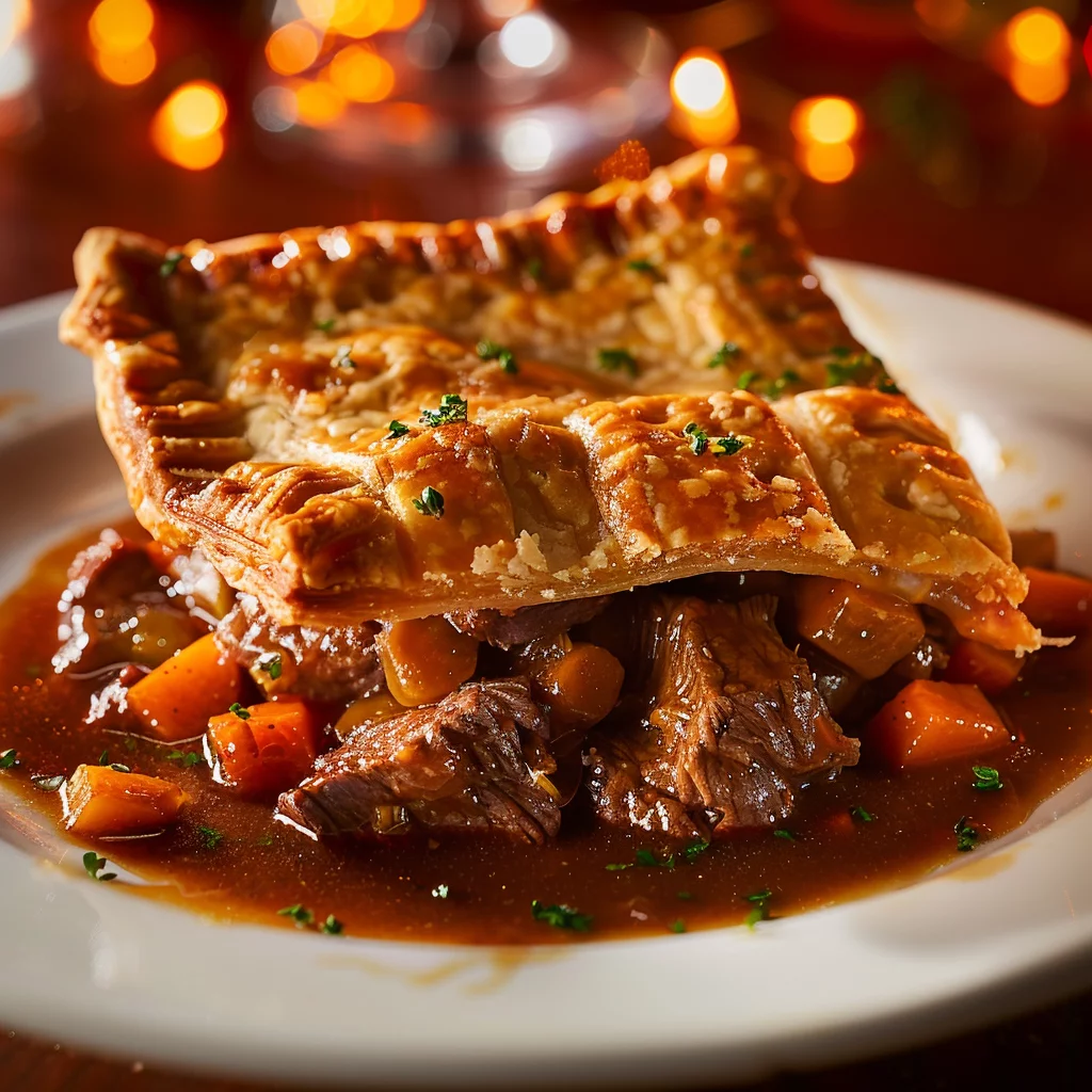 Start by preheating your oven to 350°F (175°C) and lightly greasing a 9-inch deep pie dish. In a bowl, mix beef cubes with the spices and flour. In a saucepan, sauté onions and garlic in vegetable oil until softened. Add the seasoned beef, quickly browning it to lock in the flavors.